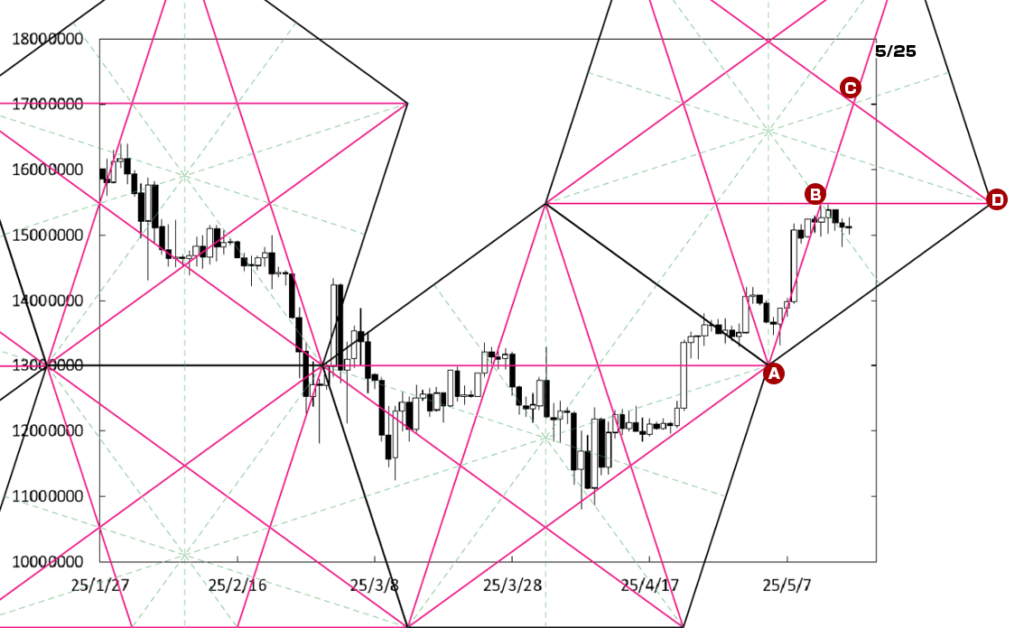 堅調な展開が続いている。直近では、A点が位置するペンタゴンのど真ん中の時間帯を通過した直後より大きく値を上げ1500万円に乗せてきた。