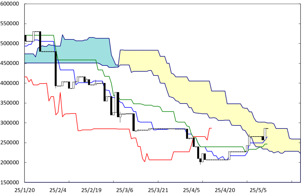 上値の重たい展開に戻る可能性もある。ペンタゴンのど真ん中の時間帯が変化日となり流れが変わる可能性があることに加え、上値抵抗線CEラインが控えている。この場合、300円を割り込んでいくことが考えられる。