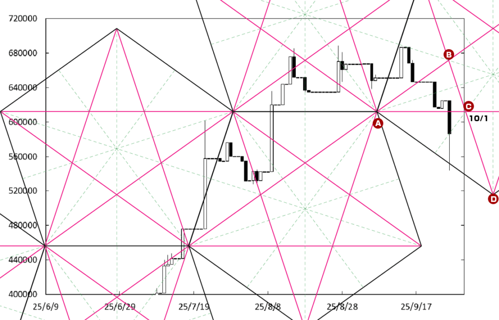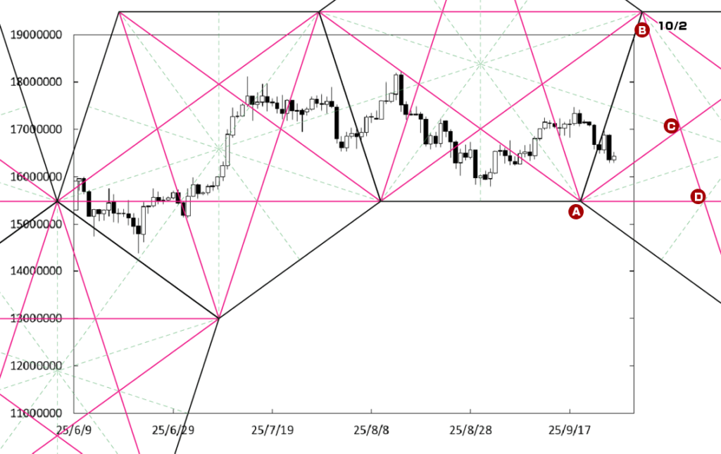 下げ止まりから堅調な展開に移行する可能性はある。B点が位置する時間帯が変化日となり流れが変わる可能性があることに加え、右肩上がりのACラインが下値支持線として控えている。この場合、1750万円を超えていくことになろう。