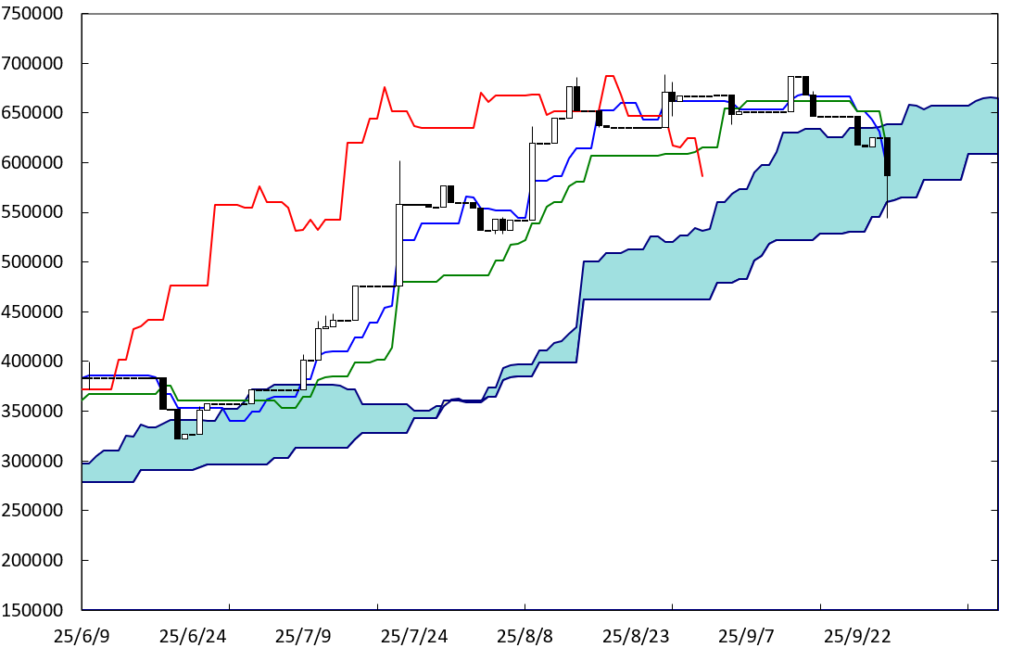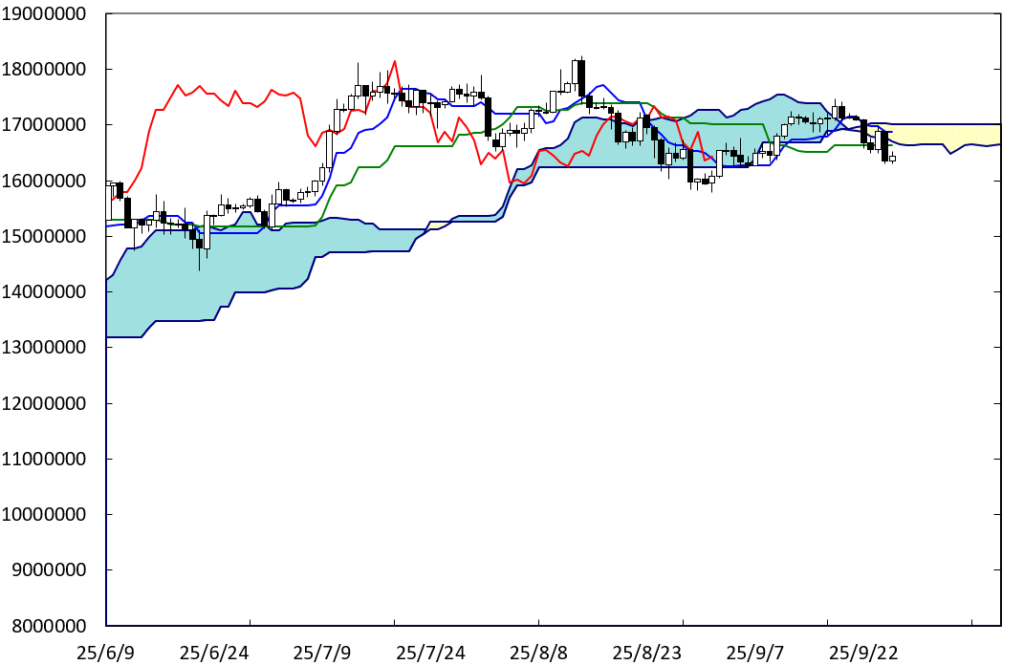 雲の中に入ってきた。ここでは、雲を割り込むことなく推移することが出来るのか否かがポイントになる。雲を割り込むことなく推移することが出来れば、堅調な展開に戻る可能性も高くなる。