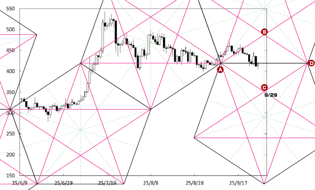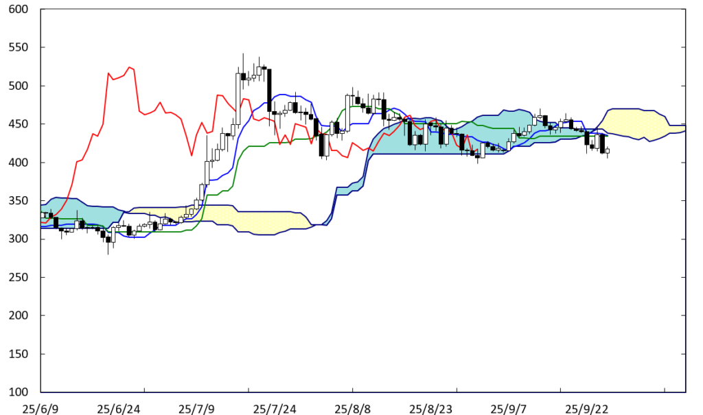 下げ止まりから堅調な展開に移行する可能性がある。ペンタゴンのど真ん中の時間帯が変化日となり、流れが変わる可能性がある。この場合、500円を窺う動きになっていこう。