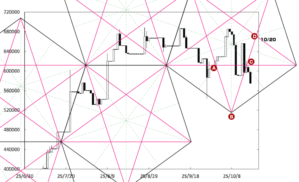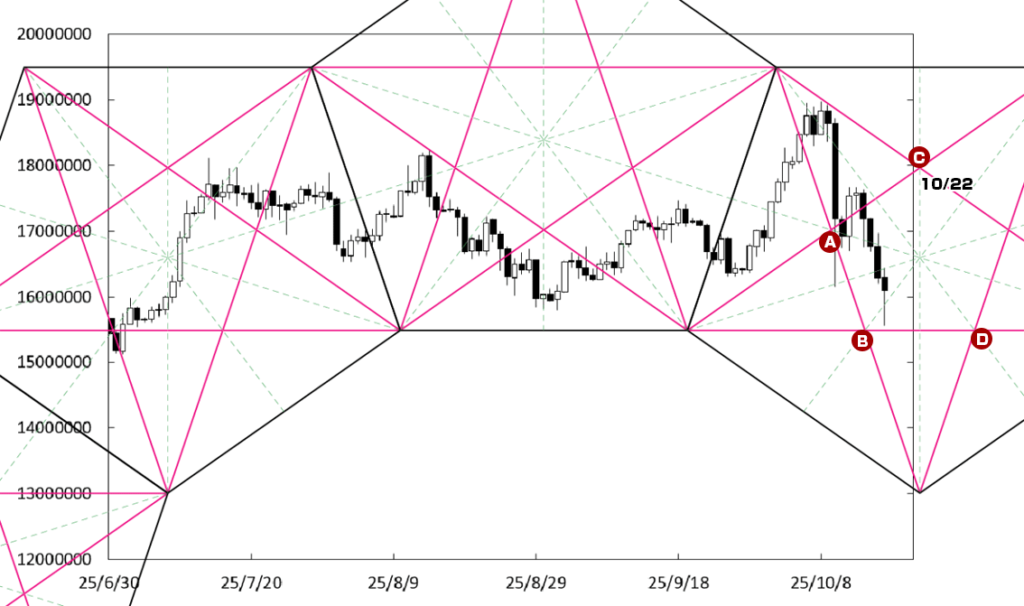 下げ止まりから落ち着いた動きに移行する可能性もある。下値支持線としてBDラインが存在していることに加え、C点が位置するペンタゴンのど真ん中の時間帯が変化日となり、流れが変わる可能性があるからだ。この場合、1800万円を超えていくことが期待される。