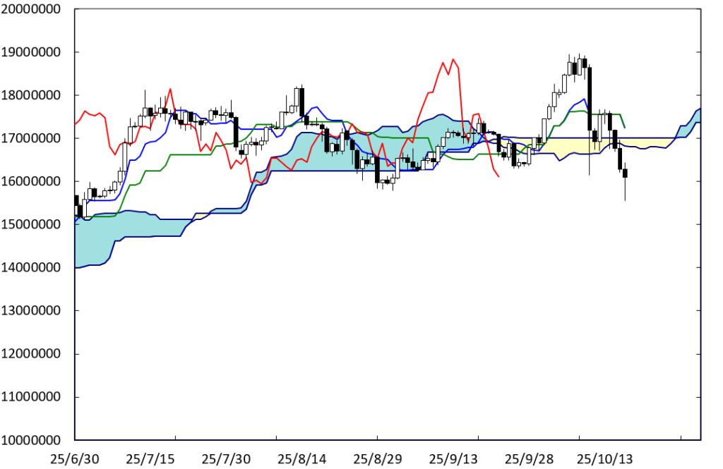上値の重たい展開が続いている。下値支持線として期待されたACラインを割り込むと、B点が位置する時間帯を通過した後も下落が続いている。この場合、1500万円を試す動きが考えられる。