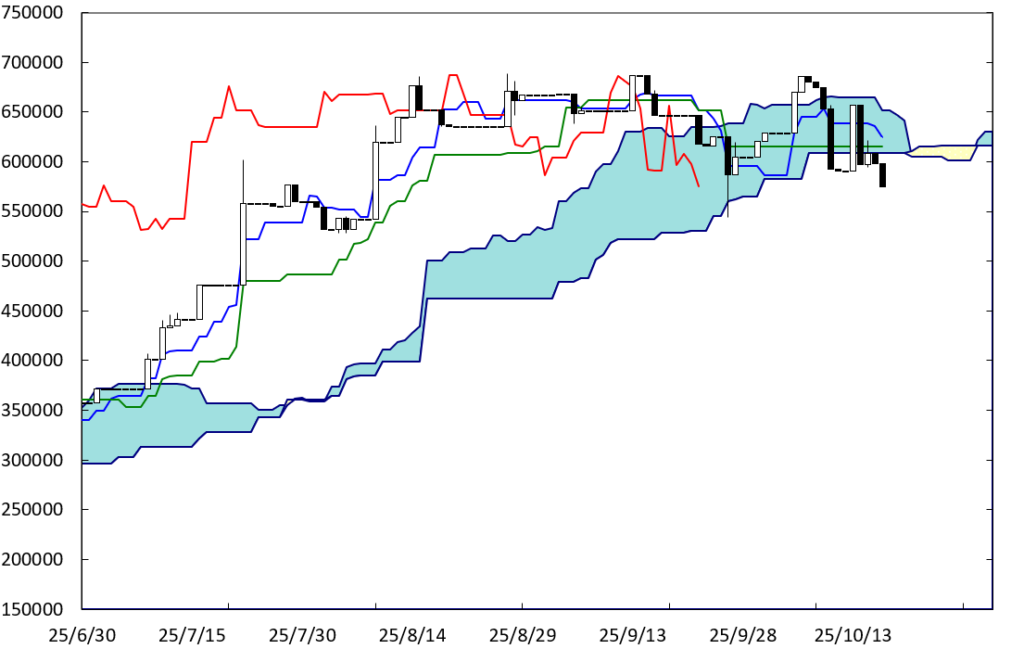 雲を割り込んだことから弱気が広がっています。まずは、雲から下放れることなく推移することが出来るのか否か、それが出来たのであれば、雲を上抜けることが出来るのか否かがポイントになってきます。
