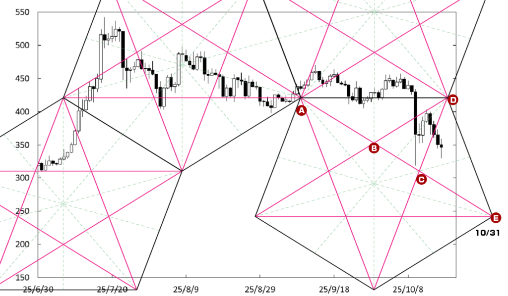 下げ止まりから堅調な展開に移行する可能性もある。D点が位置する時間帯が変化日となり流れが変わる可能性があることに加え、先週末には安値水準で同事線が出現しているからだ。この場合、400円を超えていくことが求められる。