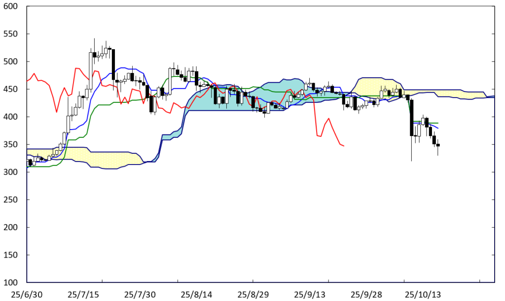 400円台前半のもち合いから下落に転じ、雲を下放れたことから弱気が広がっている。この先に雲のねじれの位置がやってくる。そこまでに下げ止まる動きを見せられるのか否かがポイントになる。