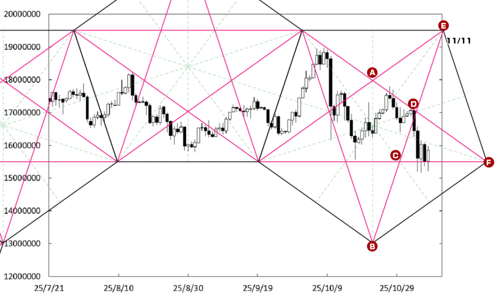 下げ止まりから落ち着いた動きに移行する可能性もある。E点が位置する時間帯が変化日となり流れが変わる可能性がある。まあ、下値支持線としてCFラインおよびBFラインが存在している。この場合、1800万円を窺う動きを期待出来よう。