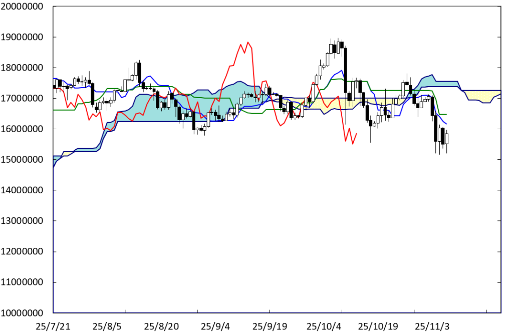 右肩下がりのADFラインが上値抵抗線となり上値の重たい展開が続いているビットコインは、1500万円台まで値を下げてきた。