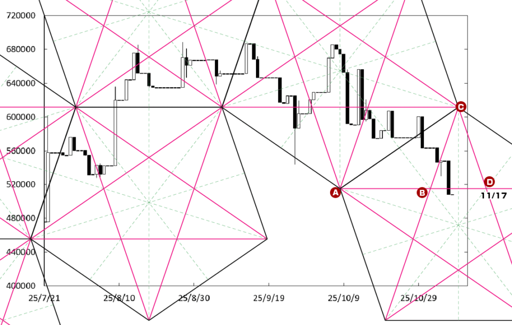 C点に注目したい。先週末にC点が位置する時間帯に到達した。したがって、同点が位置する時間帯が変化日となり、新しい動きが出てくるのか否かがポイントになる。