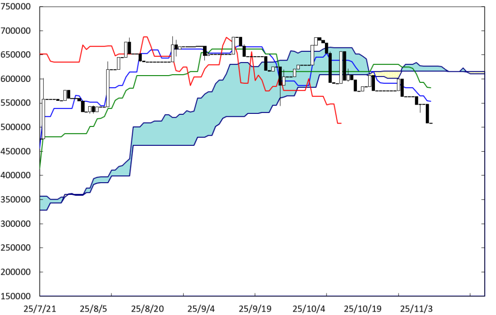 下げ止まりから落ち着いた動きに移行する可能性もある。ペンタゴンのど真ん中の時間帯が変化日となり流れが変わる可能性がある。この場合、60万円台に乗せていくことが求められる。