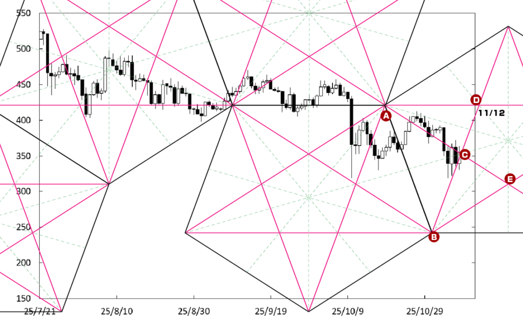 下げ止まりから堅調な展開に移行する可能性もある。C点が位置する時間帯が変化日となり、流れが変わる可能性がある。また、右肩上がりのCDラインに沿って値を上げることも考えられる。この場合、450円を窺う動きになっていこう。