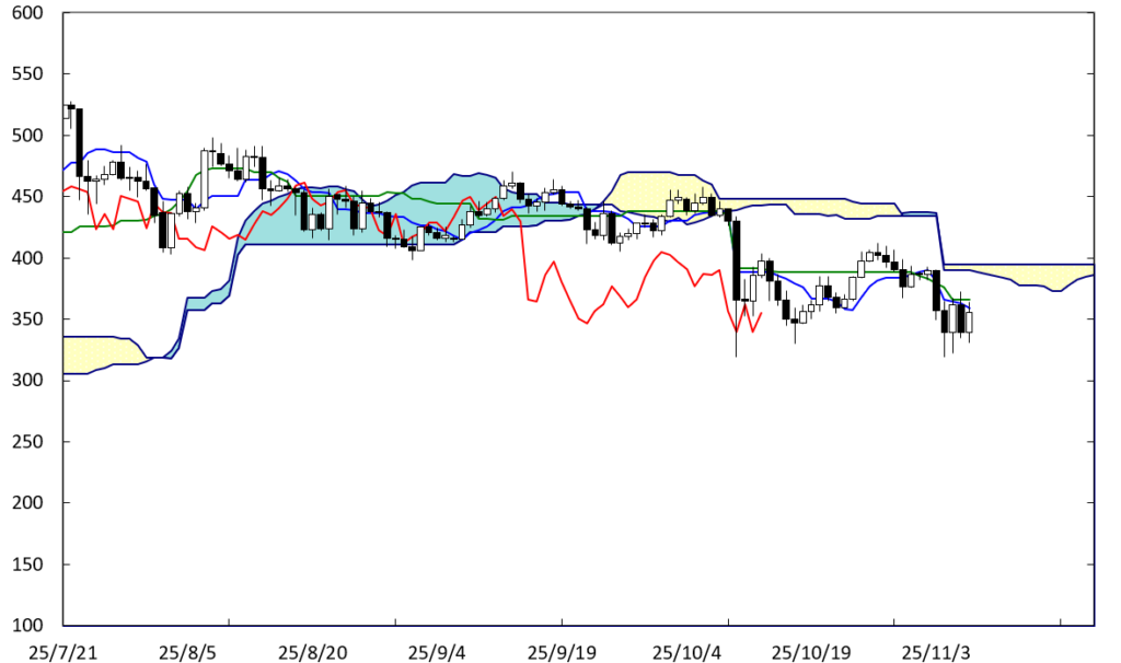 上値の重たい展開が続いている。B点が位置する時間帯を通過した後も値を下げている。また、右肩下がりのACEラインに沿って値を下げる可能性もある。この場合、300円を割り込んでいくことも考えられる。