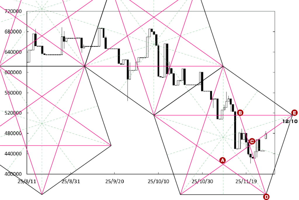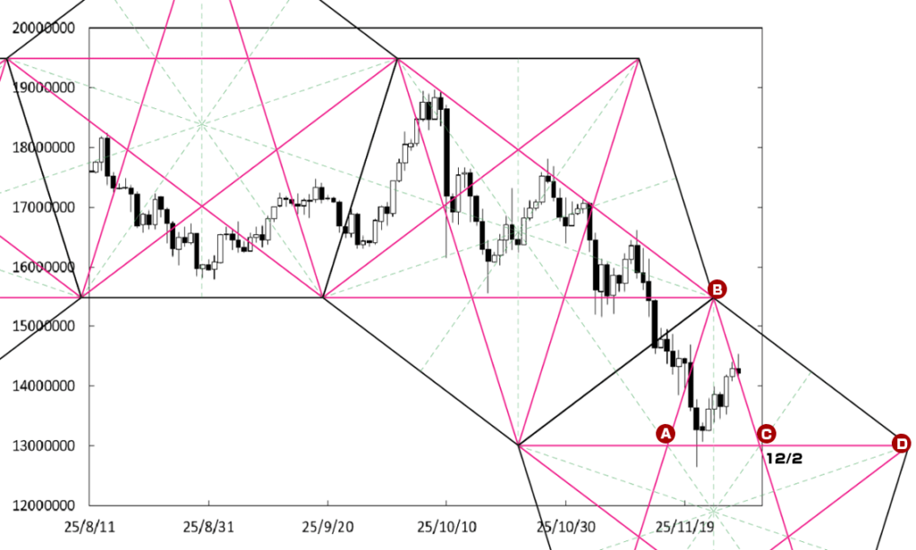堅調な展開に移行する可能性もある。B点が位置するペンタゴンのど真ん中の時間帯を通過した後も値を上げている。この場合、1550万円を超えていくことが求められる。
