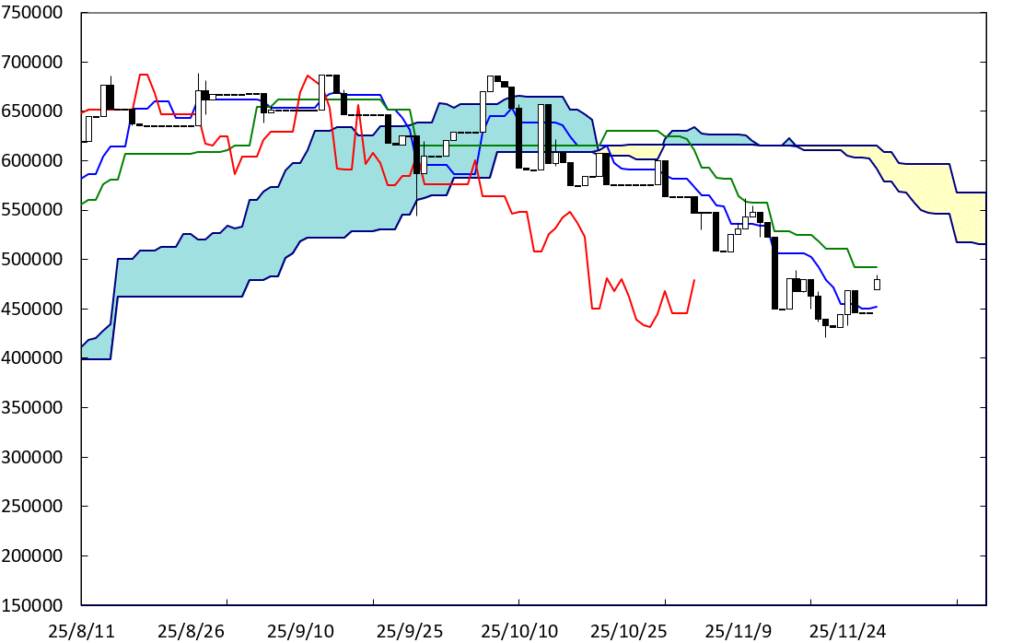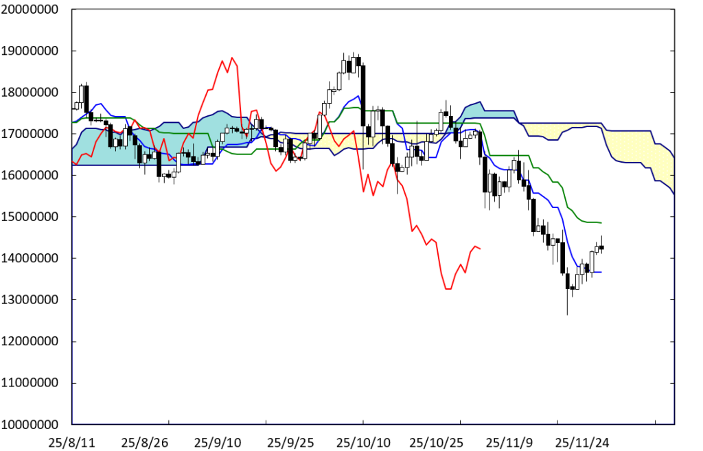 上値の重たい展開が続いている。右肩下がりのBCラインが上値抵抗線として存在している。また、BCラインを超えたとしてもBDラインが上値抵抗線として控えている。この場合、1300万円を割り込む可能性もある。