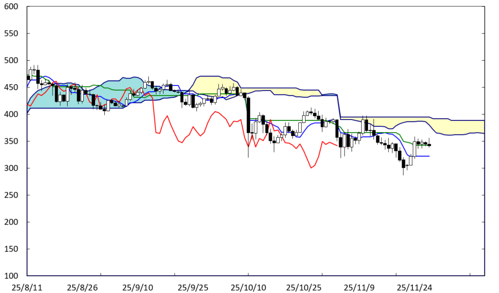 上値の重たい展開が続いている。右肩下がりのBCDラインが上値抵抗線として存在している。しかも、先週末にかけて上ヒゲの長い同事線が出現している。この場合、300円を割り込んでいくことになろう。