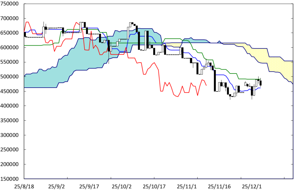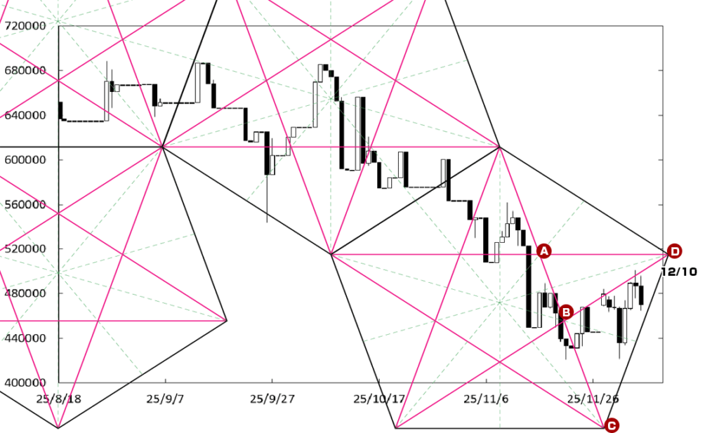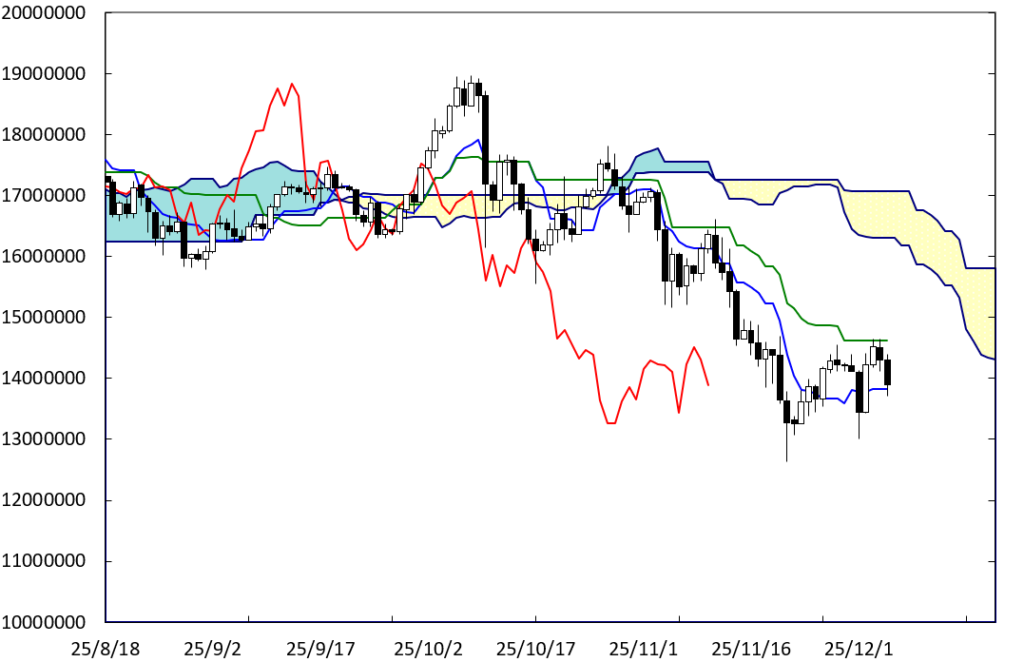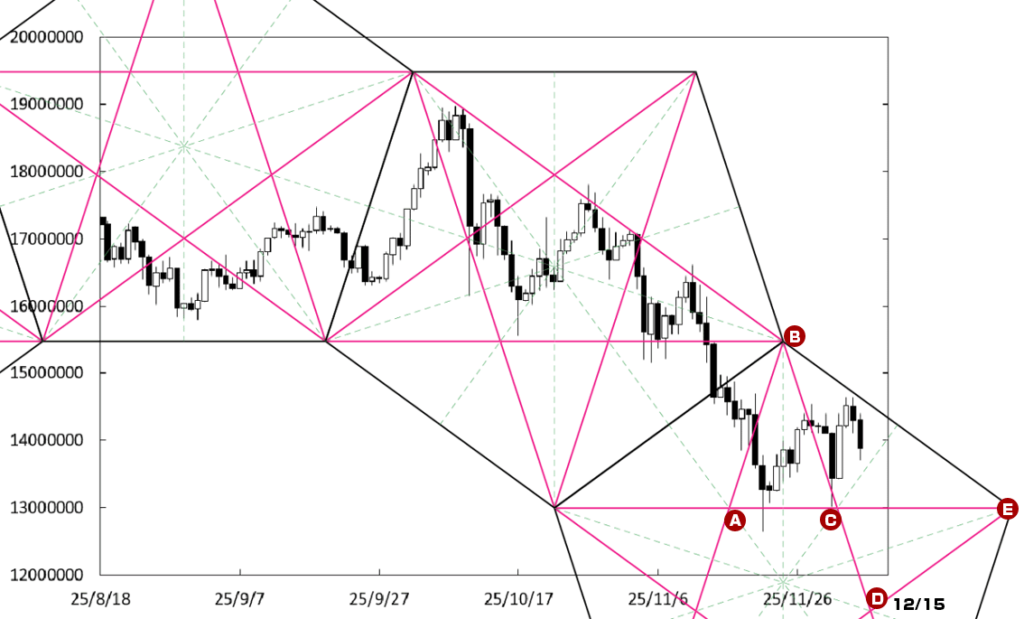 上値の重たい展開が続いている。上値抵抗線BEラインが存在していることに加え、D点が位置する時間帯が変化日となり、再び値を下げることも考えられる。この場合、1300万円を割り込んでいくことになろう。