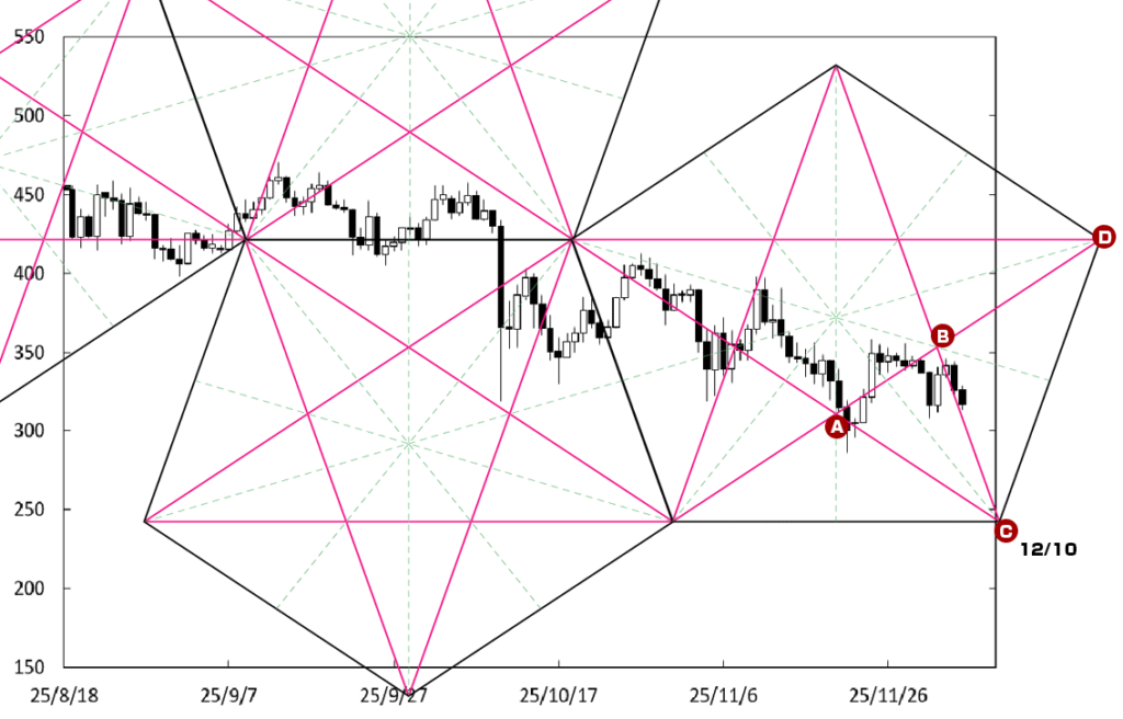 下げ止まりから堅調な展開に移行する可能性もある。C点が位置する時間帯が変化日となり流れが変わる可能性があることに加え、右肩上がりのCDラインが下値支持線として存在している。この場合、400円を窺う動きになっていこう。