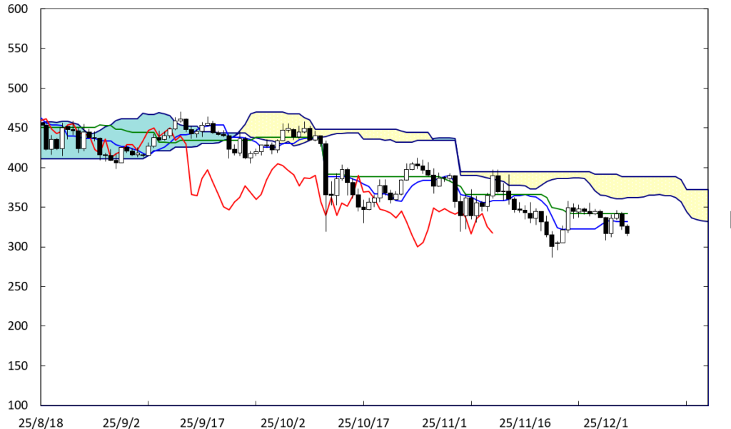 上値の重たい展開が続いている。B点が位置する時間帯より値を下げ、右肩下がりのBCラインに沿って推移している。この場合、再び300円を割り込んでいくことになろう。