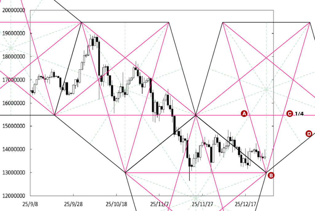 堅調な展開に移行する可能性は残っている。ペンタゴンのど真ん中の時間帯が変化日となり、流れが変わる可能性がある。また、右肩上がりのBCラインおよびBDラインが下値支持線として控えている。この場合、1500万円を超えていくことが求められる。