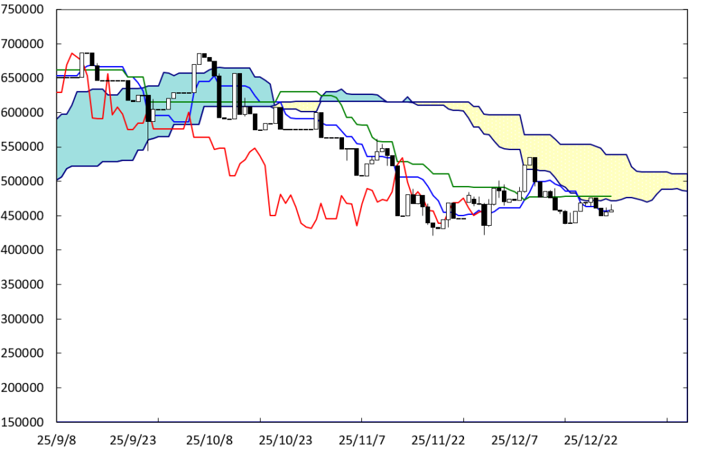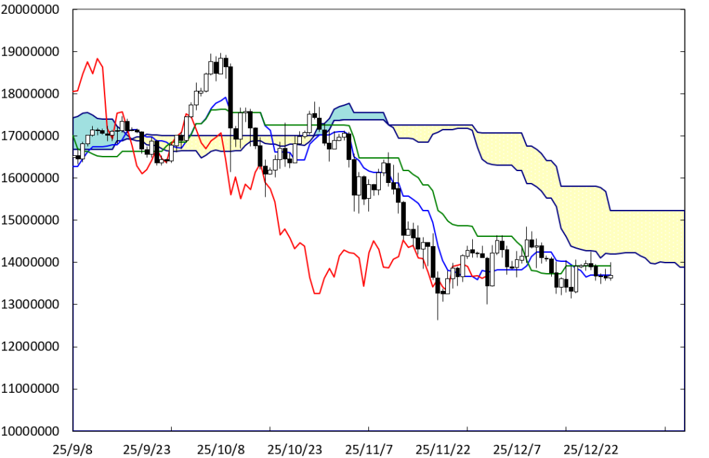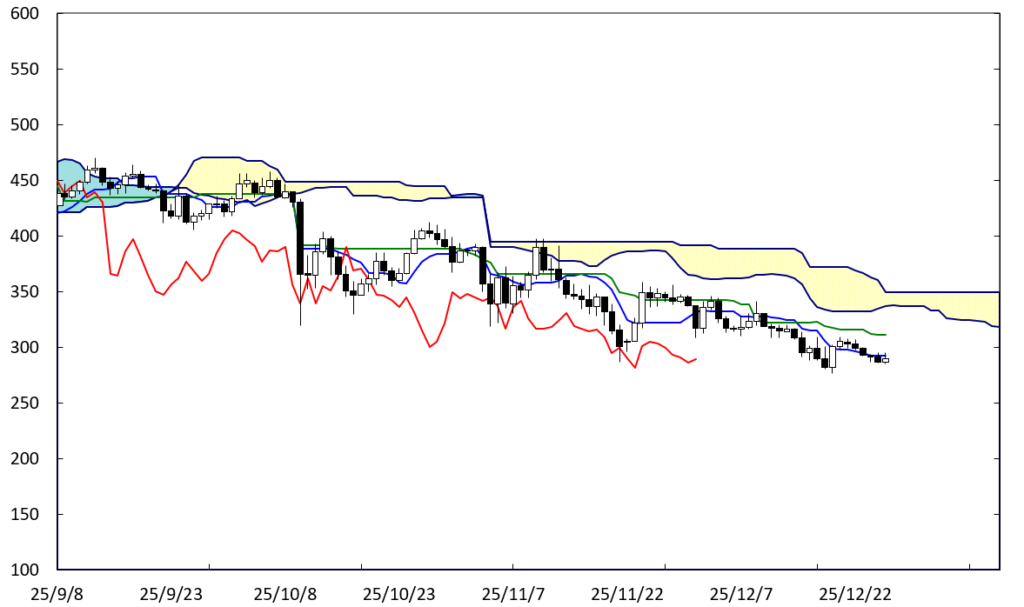 現在値は雲の下方を推移していることに加え、遅行スパンも26日前のローソク足の下方に位置している。すなわち、軟調な展開が続いている。