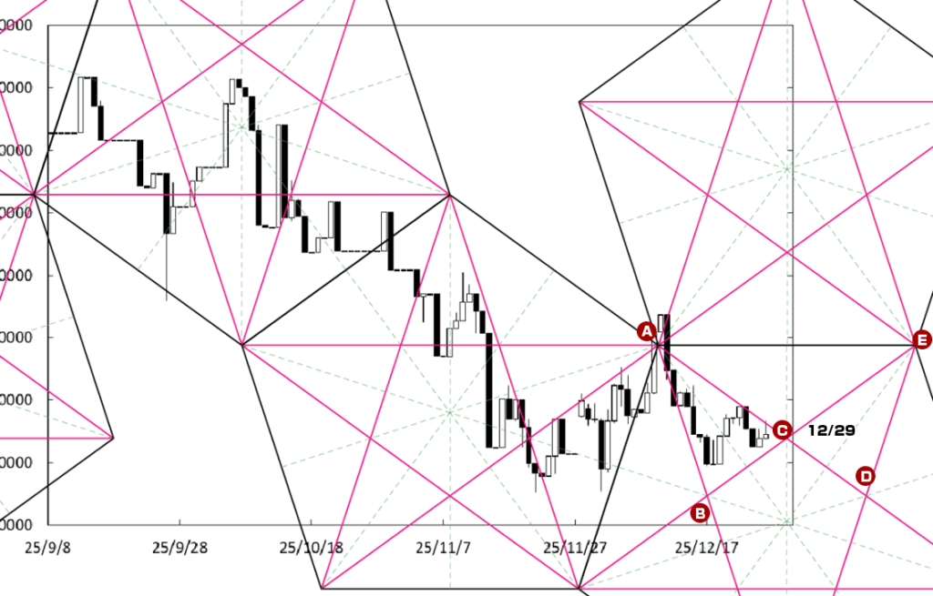 C点に注目したい。週明けにC点が位置するペンタゴンのど真ん中の時間帯を通過する。したがって、ペンタゴンのど真ん中の時間帯が変化日となり、新しい動きが出てくるのか否かがポイントになる。