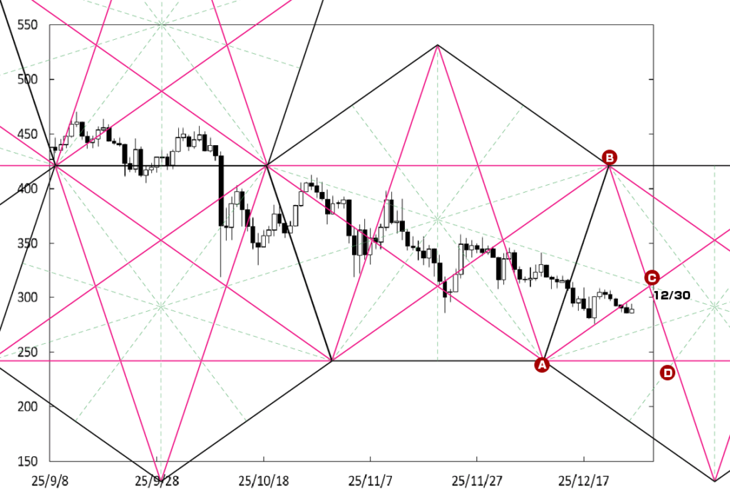 下げ止まりから堅調な展開に移行する可能性もある。C点が位置する時間帯が変化日となり、流れが変わる可能性がある。この場合、350円を超えていくことが求められる。