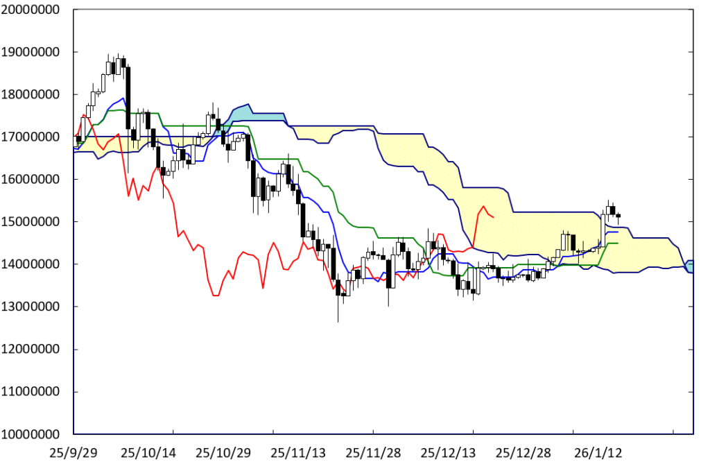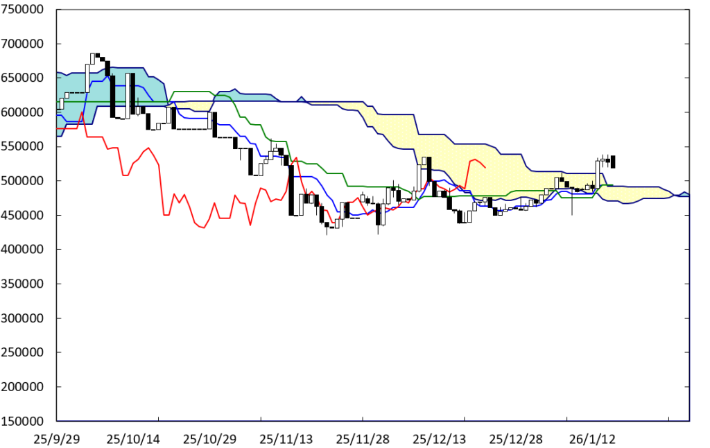 現在値が雲を上抜けたことから、堅調な展開となっていることがわかる。この場合、雲の上限が下値支持線になることが期待される。また、この先に雲のねじれの位置が接近していることにも注意をしたい。