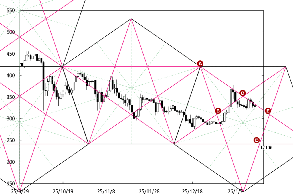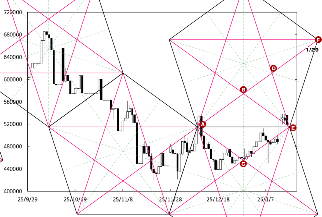 上値の重たい展開に戻る可能性もある。右肩下がりのDEラインに沿って値を下げている。また、E点が位置する時間帯が変化日となり、流れが変わる可能性がある。この場合、48万円を割り込んでいくことになろう。