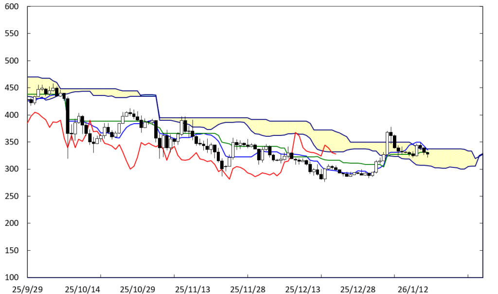 上値の重たい展開に移行する可能性がある。下値支持線として期待されたBCラインを割り込んでしまったことに加え、右肩下がりのCEラインが上値抵抗線として存在している。この場合、300円を割り込んでいくことになろう。