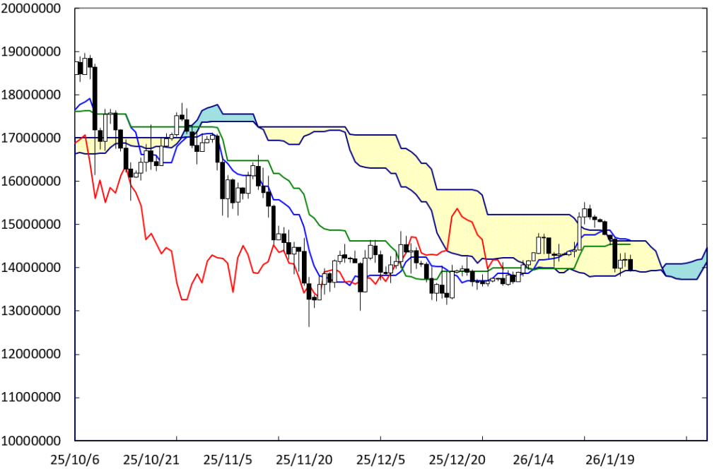 下げ止まりから堅調な展開に移行する可能性はある。ペンタゴンのど真ん中の時間帯が変化日となり、流れが変わる可能性がある。また、CDラインに沿って値を戻す可能性も残されている。この場合、1550万円を窺う動きになっていこう。