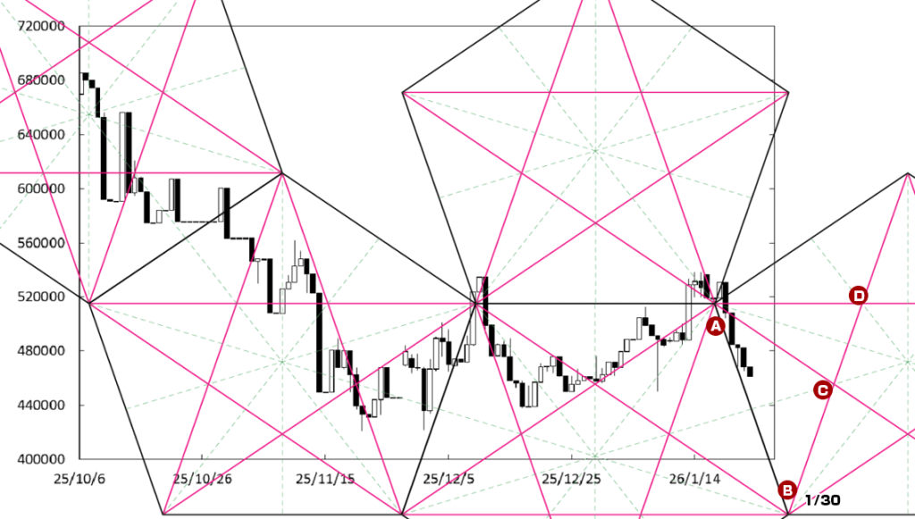下げ止まりから堅調な展開も戻る可能性も残っている。B点が位置する時間帯が変化日となり、流れが変わる可能性があるからだ。この場合、52万円を窺う動きになっていこう。