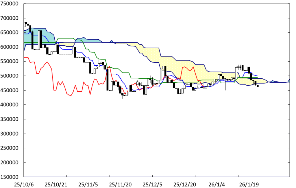 雲の中に戻ってしまった。そして、先週末の価格は雲の下限で止まっている。したがって、雲を割り込むことになるのか否かがポイントになる。割り込むと、弱気が広がることから下値を試す動きになっていこう。なお、雲のねじれの位置が接近していることにも注意。