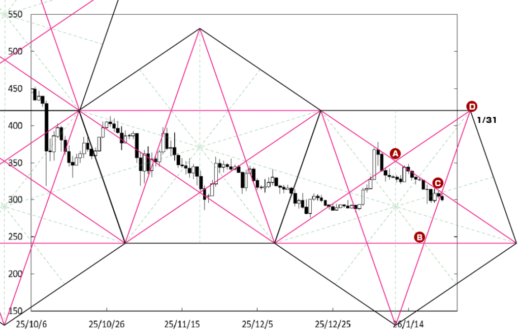 下げ止まりから堅調な展開に移行する可能性も残っている。C点が位置する時間帯が変化日となり、流れが変わる可能性がある。この場合、400円を窺う動きを期待出来よう。