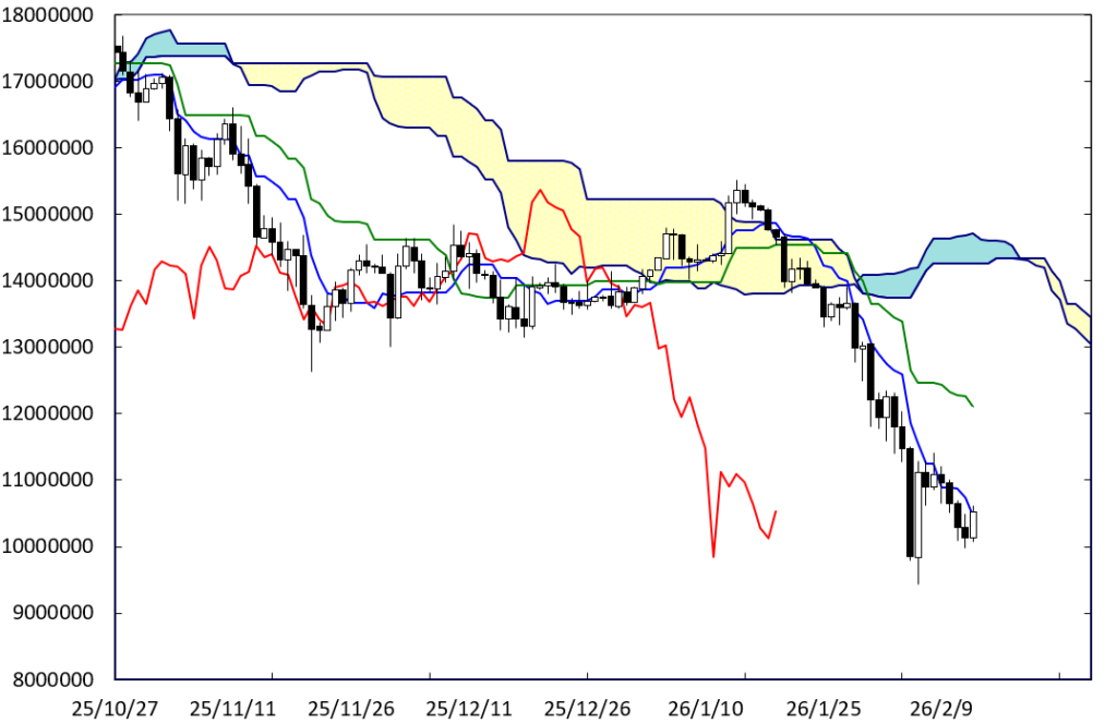 軟調な展開が続いている。ペンタゴンのど真ん中の時間帯を通過した後も下落が続いている。また、右肩下がりのCDラインに沿って値を下げている。この場合、900万円を試す可能性がある。