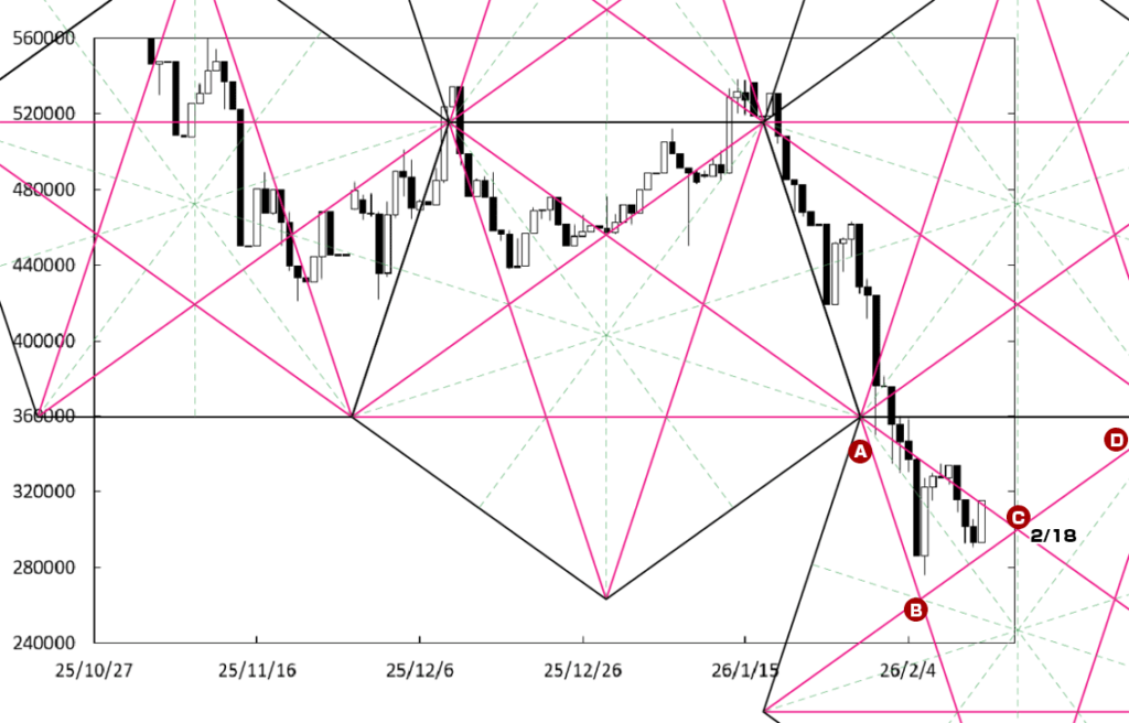 下げ止まりから堅調な展開に移行する可能性もある。右肩上がりのBCDラインが下値支持線として存在していることに加え、ペンタゴンのど真ん中の時間帯が変化日となり流れが変わる可能性がある。この場合、40万円を窺う動きを期待出来よう。