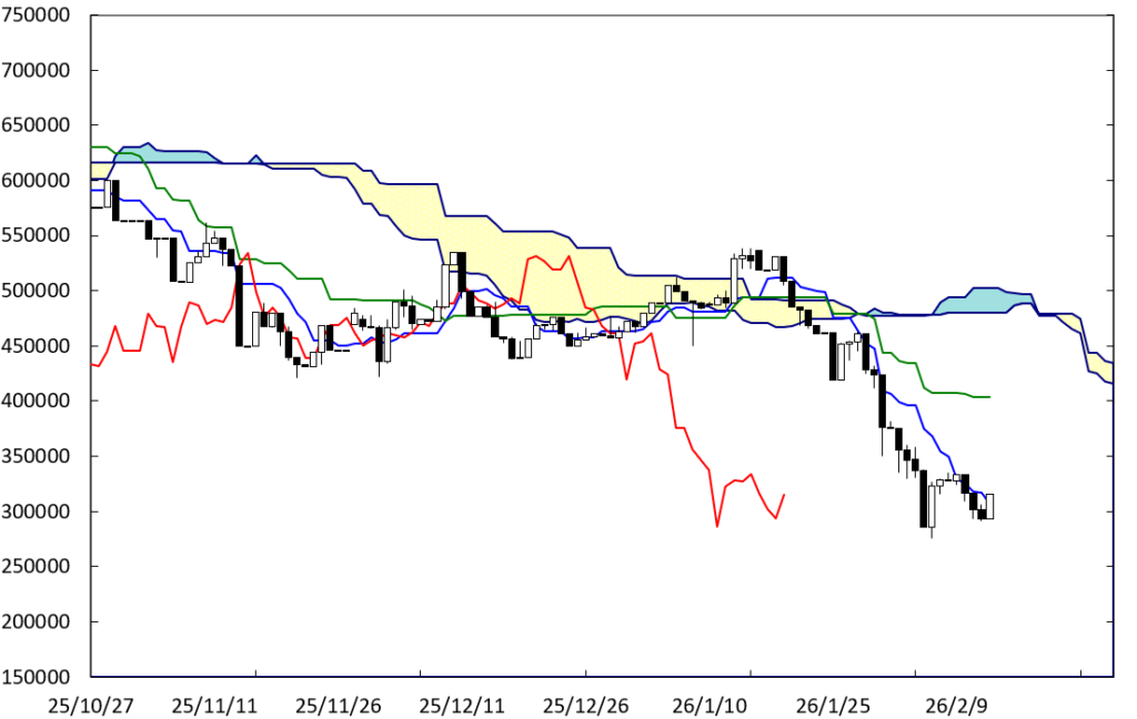 軟調な展開が続いているイーサリアムだが、この後に雲のねじれの位置を通過していく。したがって、ねじれの位置が変化日となり、新しい流れが出てくるのか否かがポイントになる。