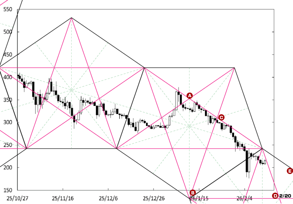 下げ止まりから落ち着いた動きに移行する可能性はある。D点が位置する時間帯が変化日となり流れが変わる可能性があることに加え、右肩上がりDEラインが下値支持線として存在している。この場合、1200万円を超えていくことになろう。