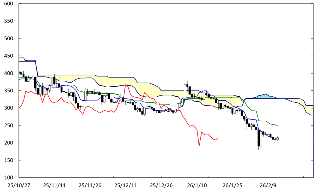 軟調な展開が続いている。右肩下がりのACラインが上値抵抗線として存在している。また、ACラインを超えたとしてもADラインも上値抵抗線として控えている。この場合、25万円を試す可能性がある。