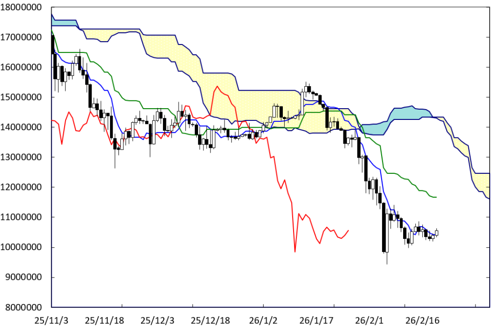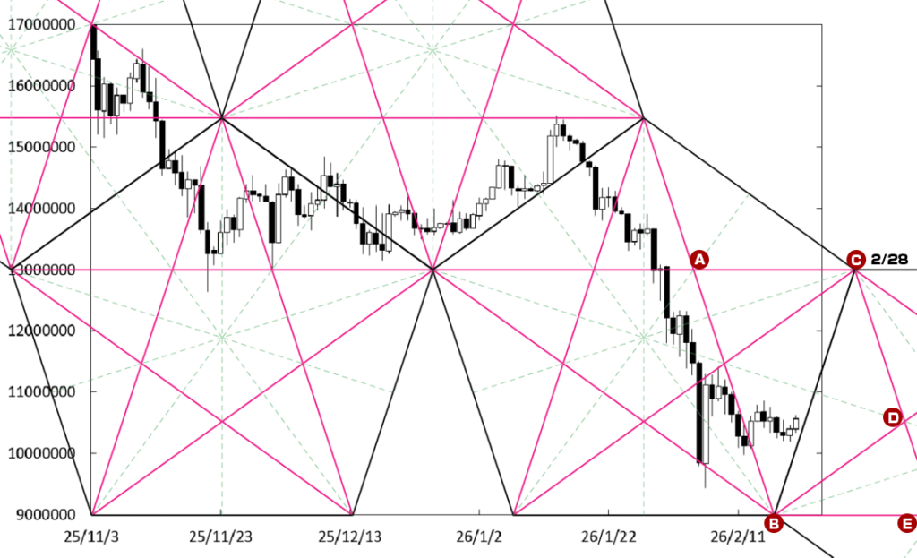 下げ止まりから堅調な展開に移行する可能性もある。右肩上がりのBCラインが存在している。C点が位置する時間帯が変化日となり、流れが変わる可能性がある。この場合、1200万円を窺う動きになっていこう。