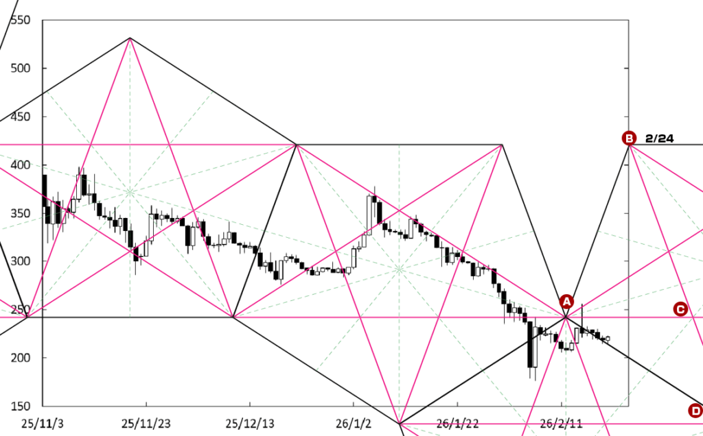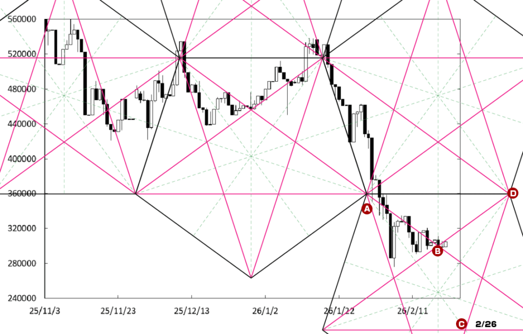 下げ止まりから堅調な展開に移行する可能性がある。ペンタゴンのど真ん中の時間帯が変化日となり流れが変わる可能性があることに加え、右肩上がりのBDラインが下値支持線として存在している。この場合、40万円を窺う動きになっていこう。