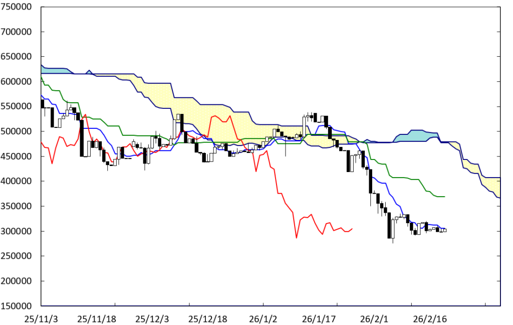 雲の下方を推移しているが、直近では下げ止まる動きを見せている。特に、雲のねじれの位置を通過した後も下落することなく推移している。