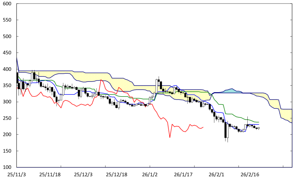 軟調な展開が続いている。右肩下がりのADラインに沿って推移していることに加え、上値抵抗線ACラインが存在している。この場合、200円を割り込んでいくことになろう。