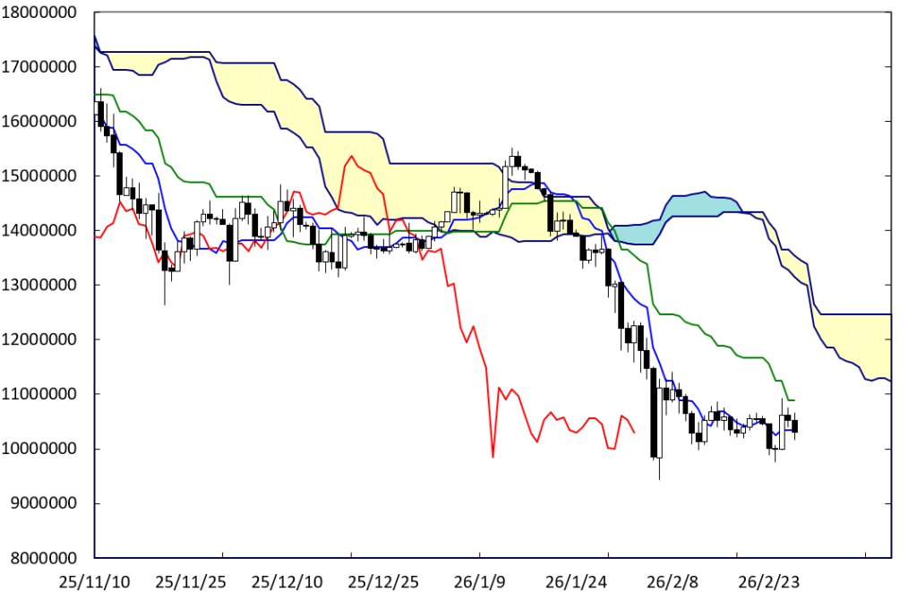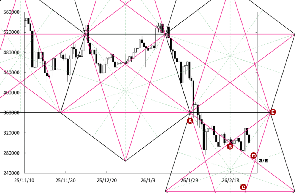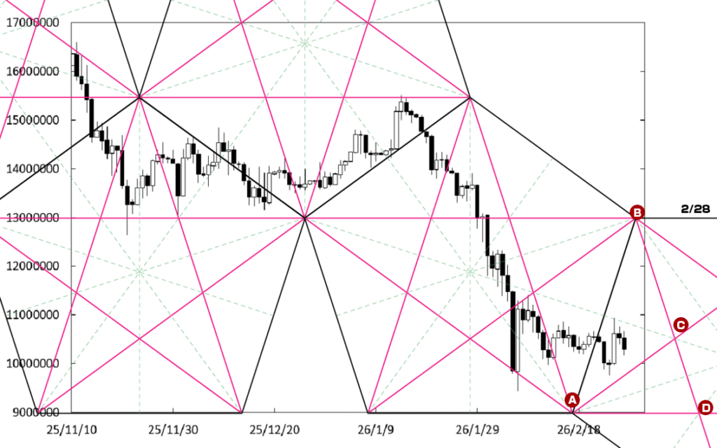下げ止まりから堅調な展開に移行する可能性も残っている。先週末に到達したB点が位置する時間帯が変化日となり流れが変わる可能性があることに加え、下値支持線としてACラインが存在しているからだ。この場合、1200万円を窺う動きを期待出来よう。