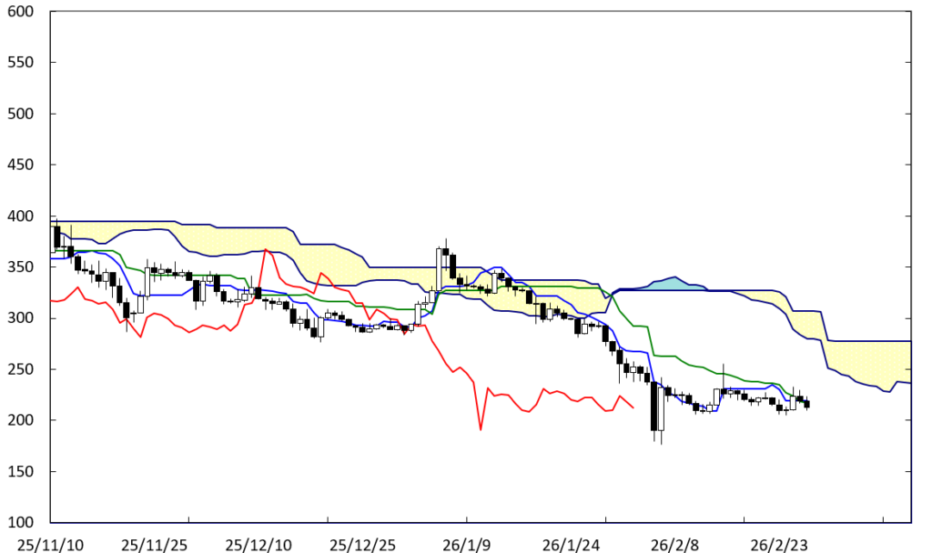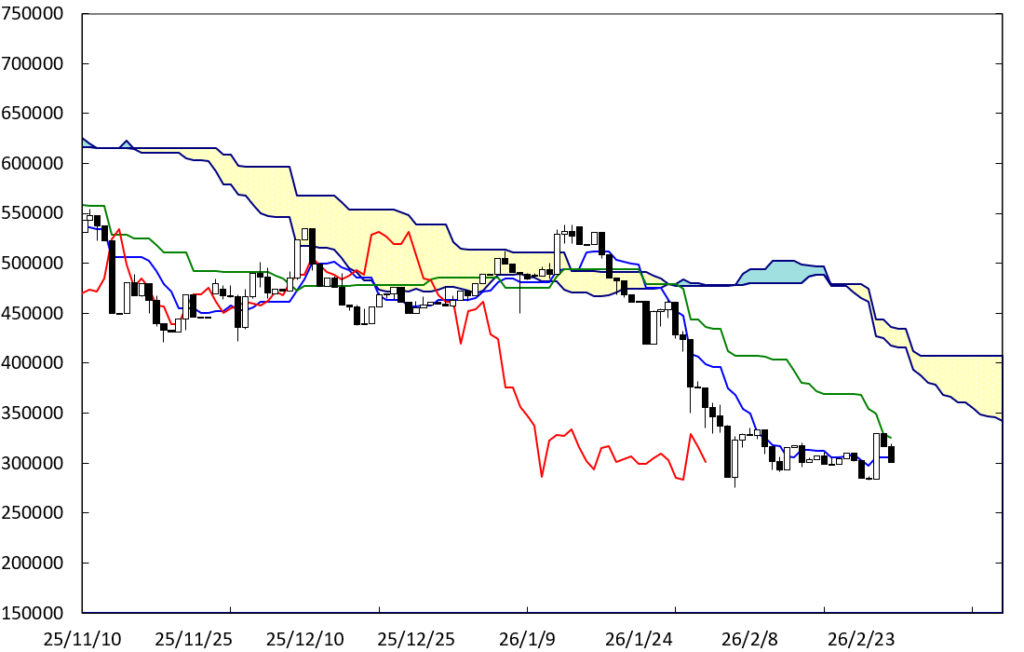 ビットコイン同様、遅行スパンが26日前のローソク足に接近している。また、基準線が低下してきていることから、現在値が基準線を超えていく可能性も出てきている。週明けの動きには要注意である。