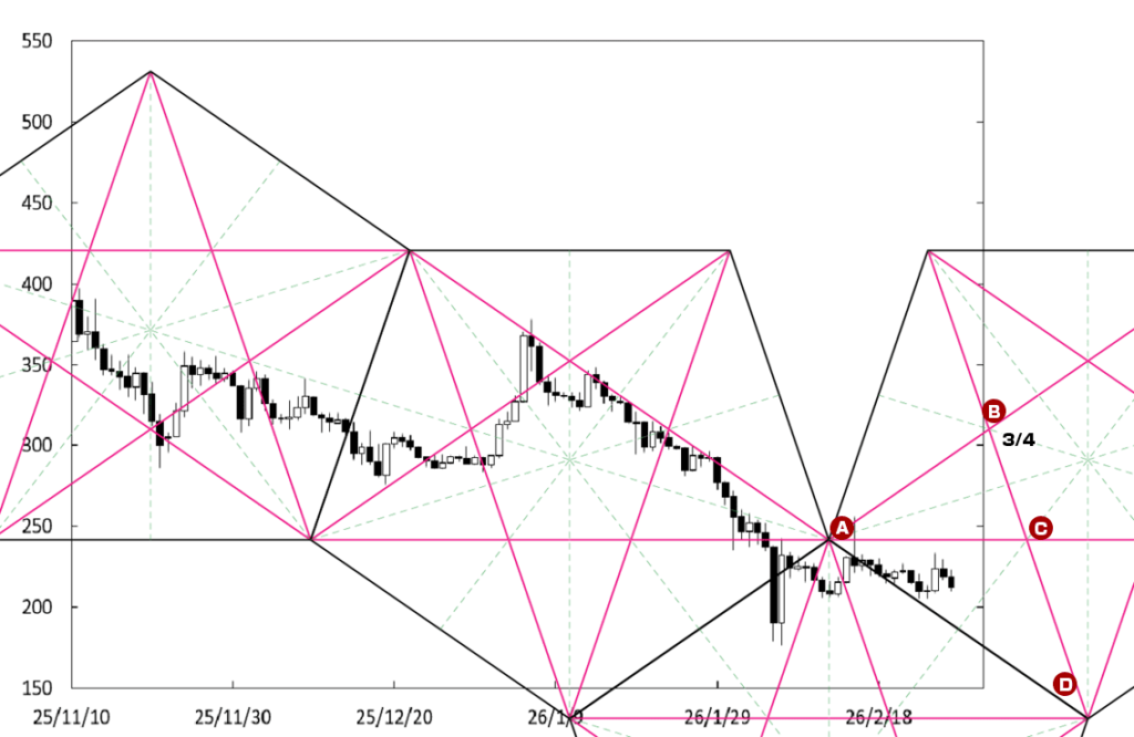 下げ止まりから堅調な展開に移行する可能性も残っている。B点が位置する時間帯が変化日となり、流れが変わる可能性があるからだ。この場合、250円を超えていくことになる。