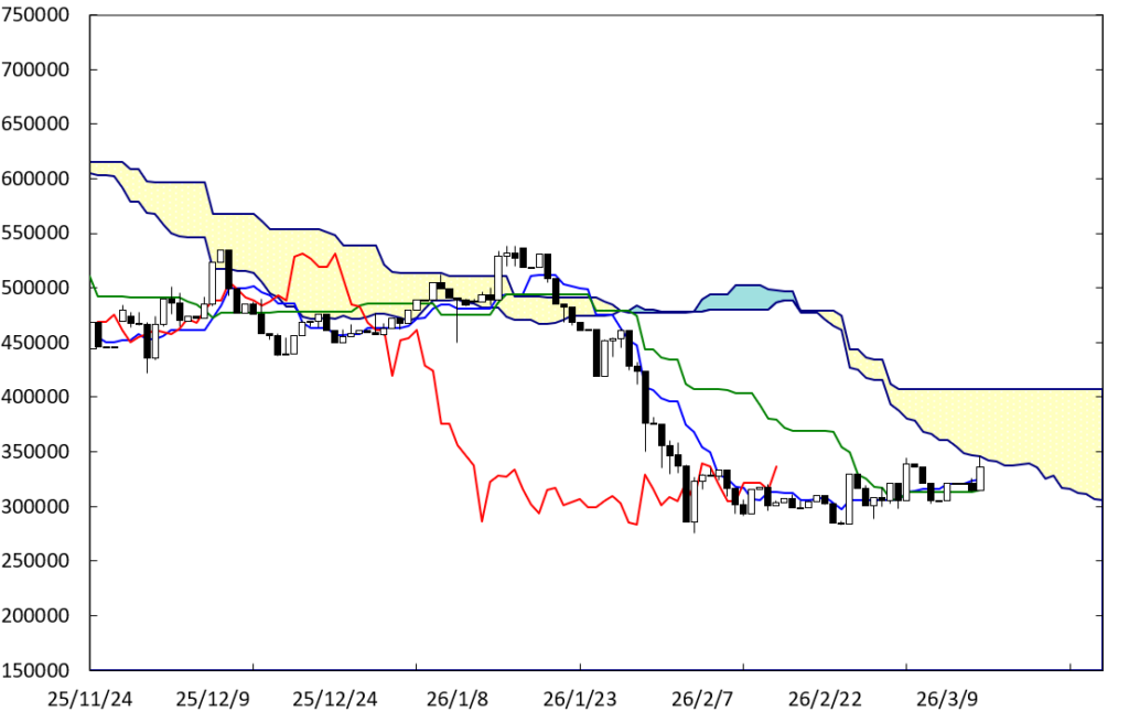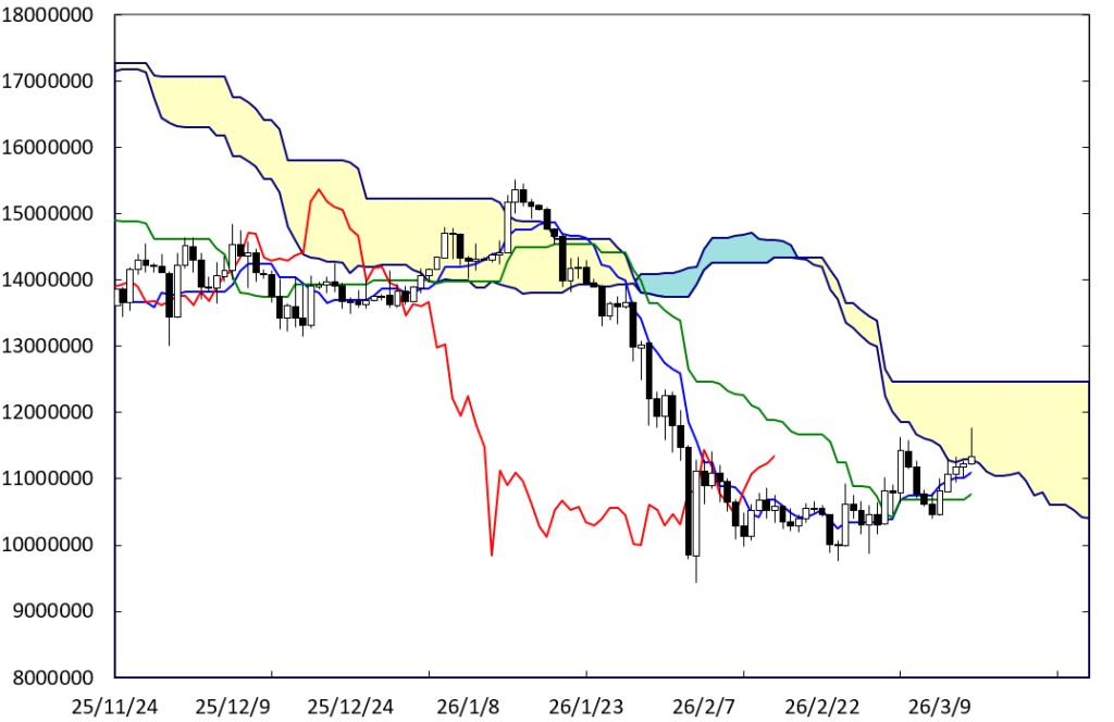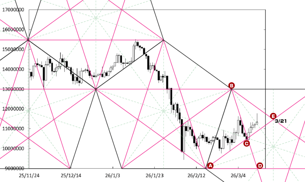 上値の重たい展開に移行する可能性もある。D点が位置する時間帯が変化日となり流れが変わる可能性がある。また、右肩下がりのBEラインが上値抵抗線として控えている。しかも、BEラインの真下で上ヒゲの長いローソク足が出現している。この場合、1000万円を試す動きになっていこう。