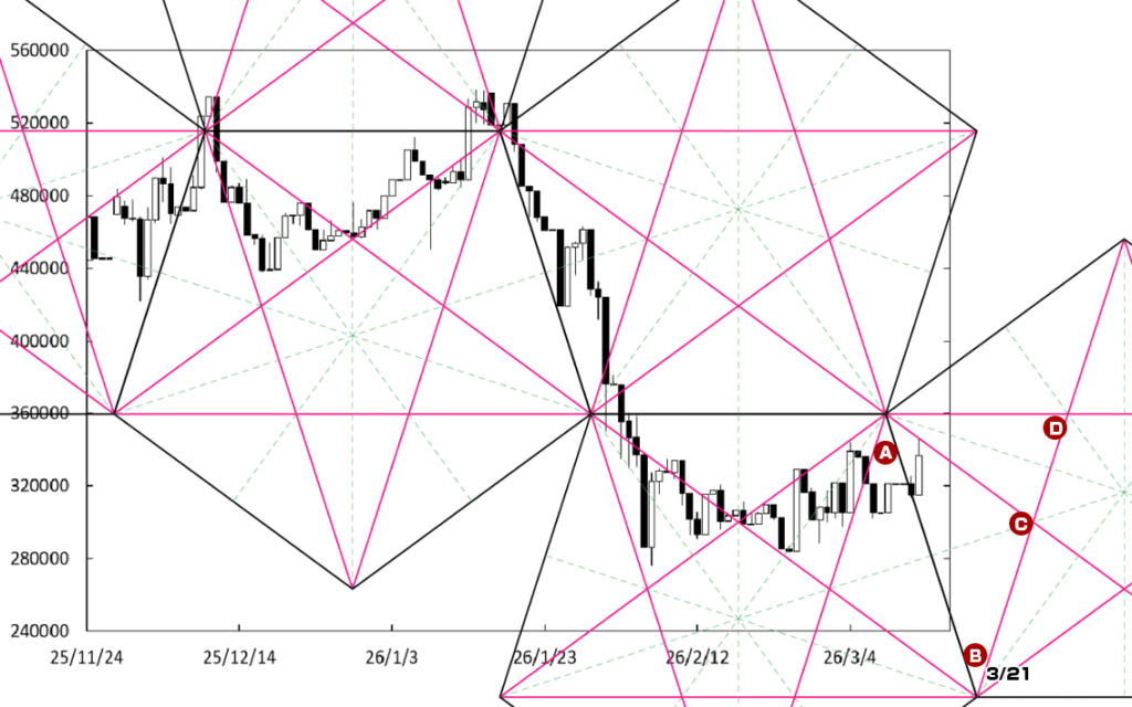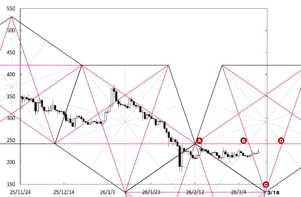 D点に注目したい。先週末にD点が位置する時間帯に到達した。したがって、同点が位置する時間帯が変化日となり、新しい動きが出てくるのか否かがポイントになる。