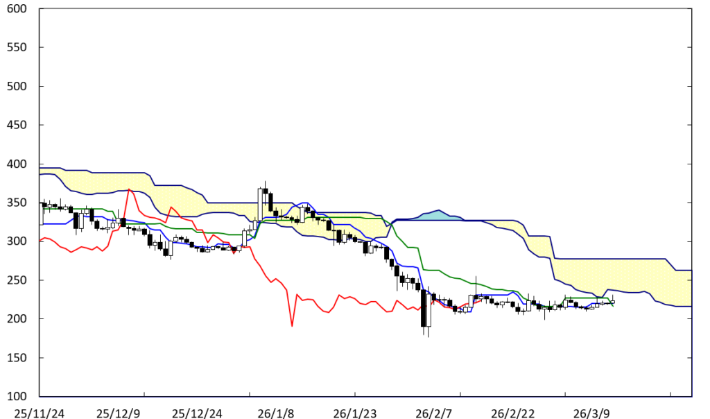 上値の重たい展開が続いている。下値でのもち合いが続いていることに加え、上値抵抗線としてBDラインが存在している。この場合、200円を割り込む可能性もある。