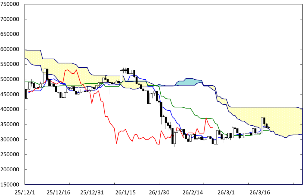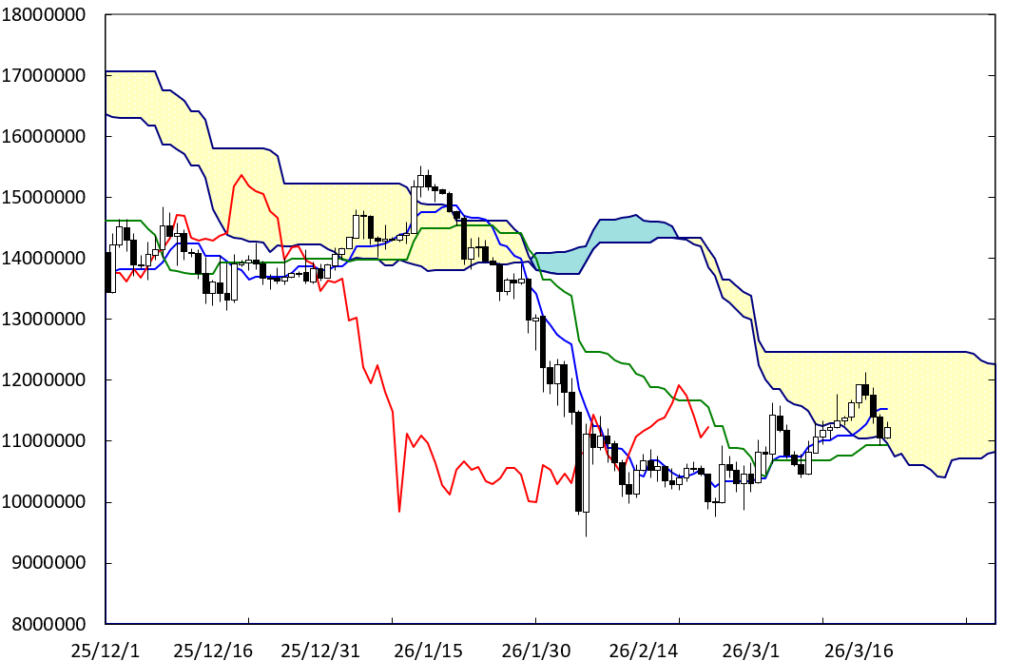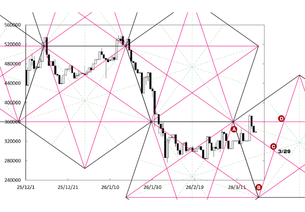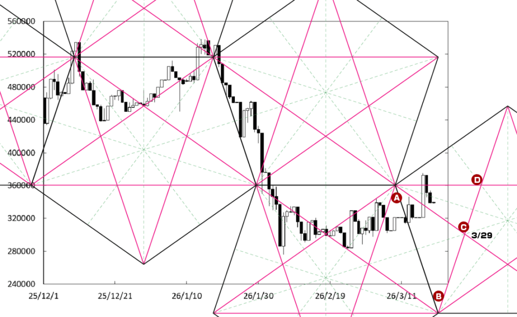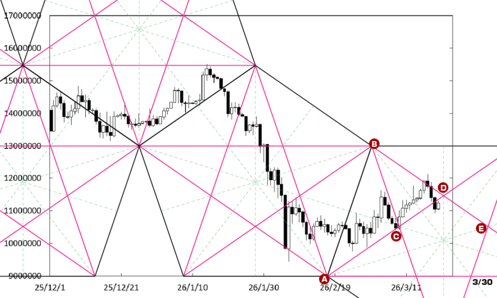 上値の重たい展開に移行する可能性はある。D点が位置するペンタゴンのど真ん中の時間帯が変化日となり、流れが変わる可能性がある。また、右肩下がりのBDEラインが上値抵抗線として控えている。この場合、1000万円を割り込んでいくことも考えられる。