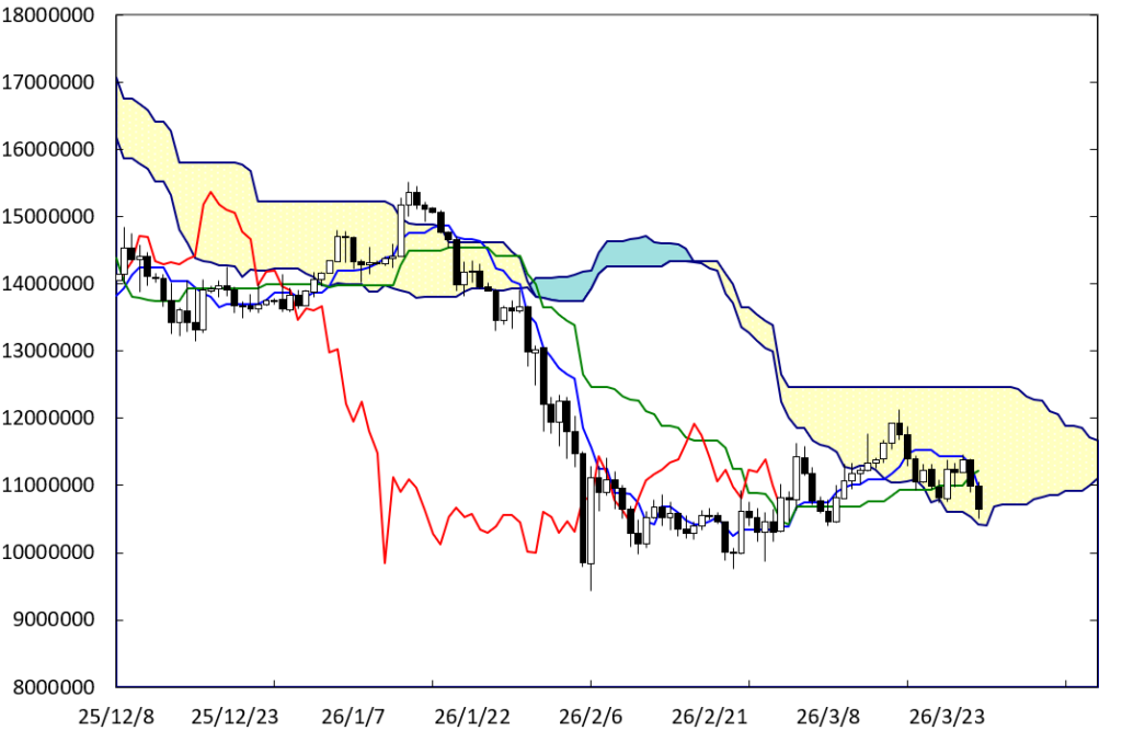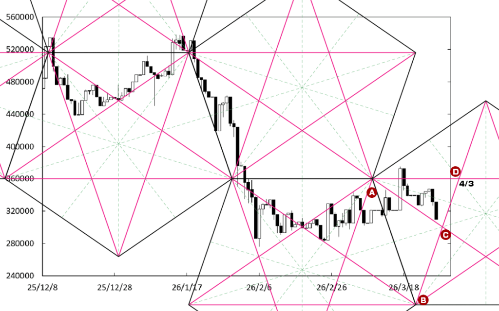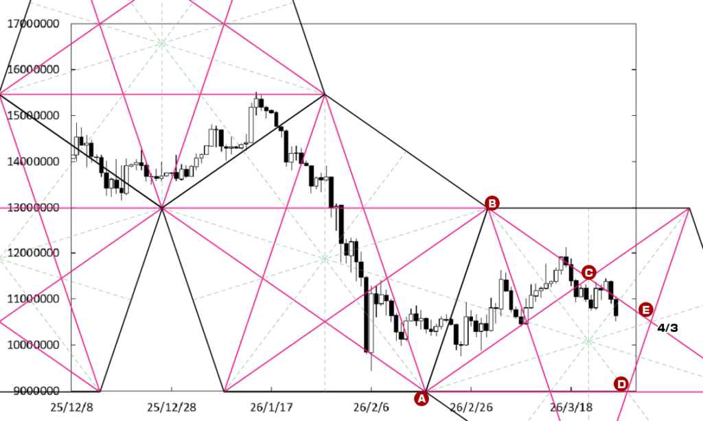 下げ止まりから堅調な展開に移行する可能性もある。先週末に到達したD点が位置する時間帯が変化日となり、流れが変わる可能性があるからだ。また、右肩上がりのDEラインも下値支持線として控えている。この場合、1200万円を窺う動きになっていこう。